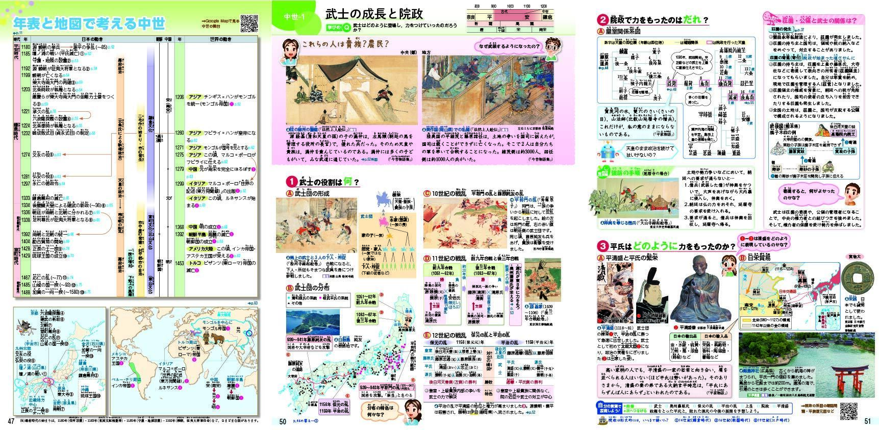 「時代へようこそ」で時代の導入➡「基本ページ」で毎時の学習 ・特集「歴史のまど」でテーマ的に学習➡「時代へようこそ」へもどり、時代の大観・ふり返り 。