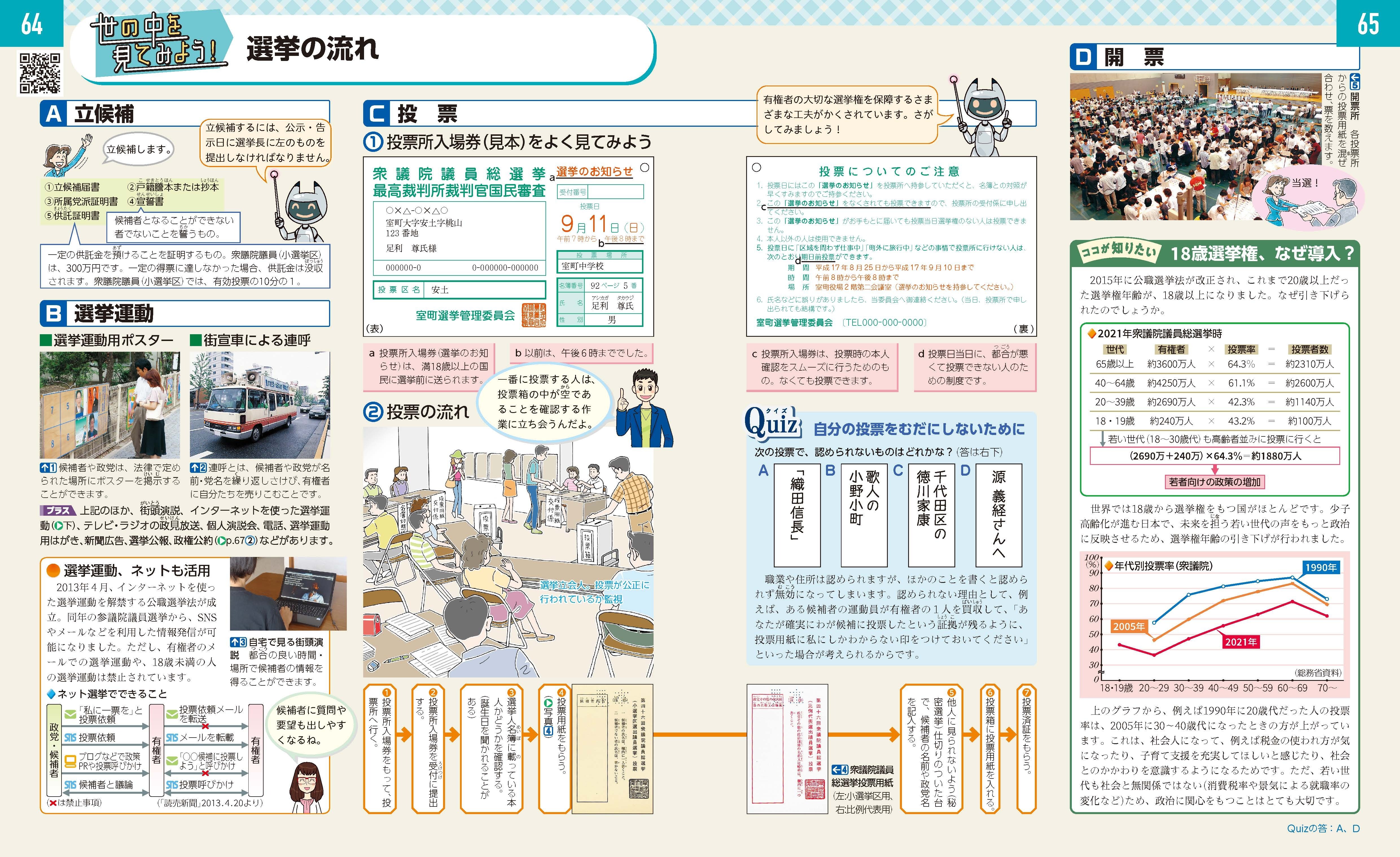 選挙の流れ(p64),裁判員裁判(p84),株式投資(p106) - 「この人に聞く!」(p90,91,138,139)…社会をより良くするために活動する人へのインタビュー。学びをどう生かすかの参考になります。