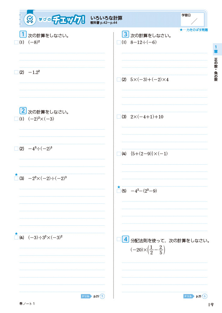 - 計算スペースにノート風ケイ線が入っています。途中式を丁寧に書く習慣が身につきます。