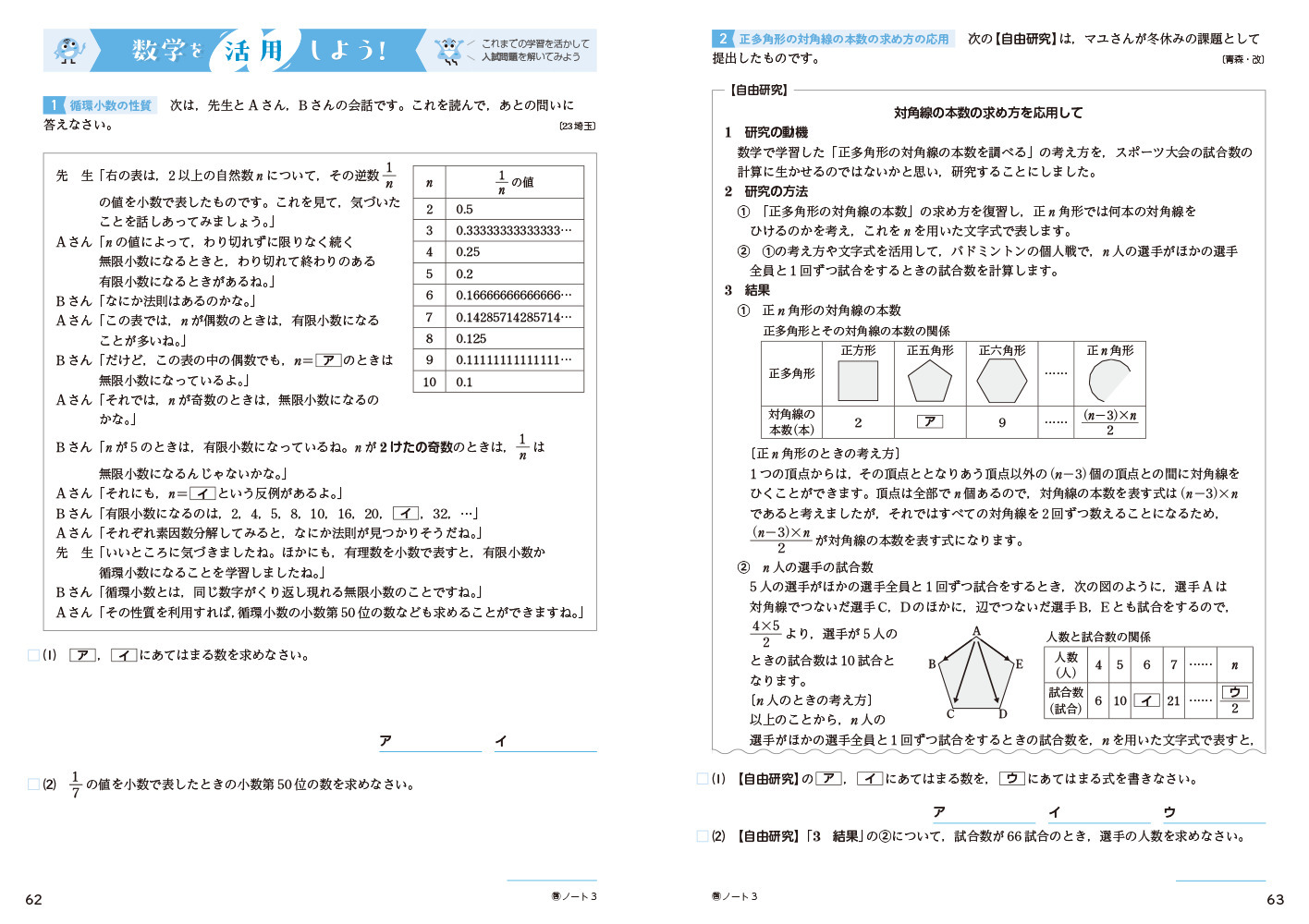 - 基本ページの最終問題に「数学力アップ問題」として、内容理解を確認する記述問題や力をためす問題を掲載しています。2~3ページに1題程度の割合で配置されているので、無理なく取り組めます。