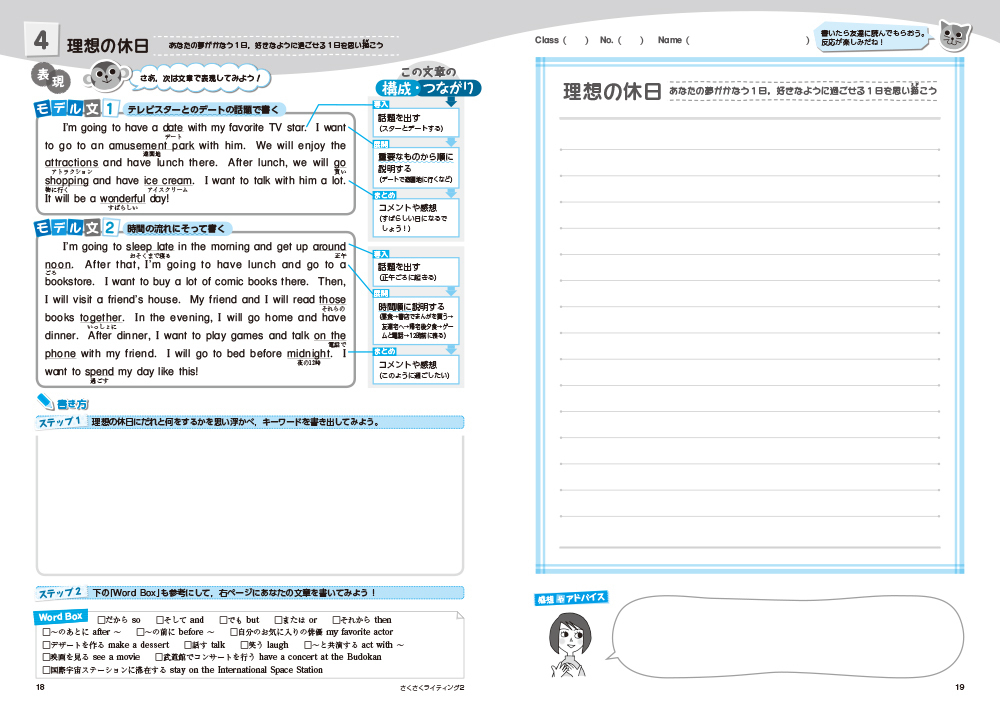 - 指導手順や、生徒への声かけ例 を掲載し、ライティング指導を支援。