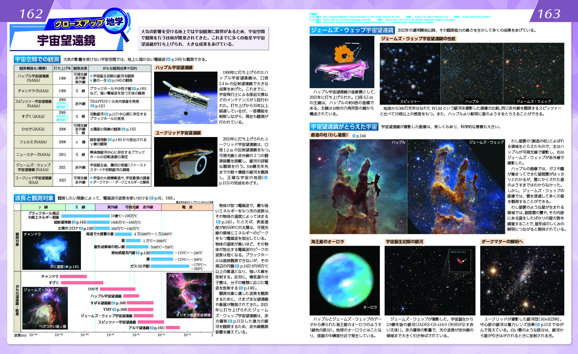 - 「宇宙望遠鏡」(p.162-163)/「恐竜の科学」(p.194-195)など,学習内容を深める話題を扱ったページです。