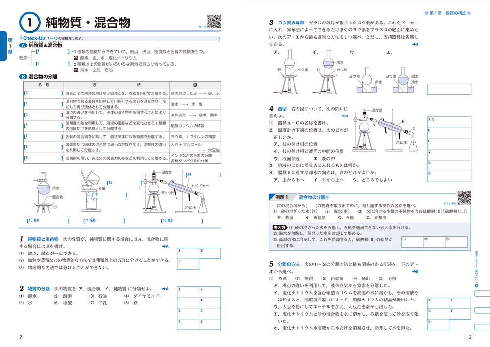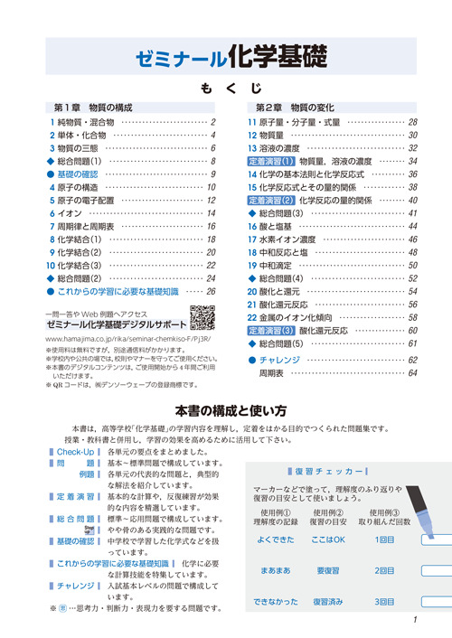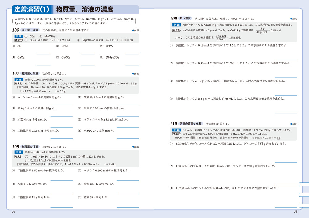 - 定着演習 基本問題の反復練習で,基礎力の定着を助けます。(物質量の計算,化学反応の量的関係,酸化還元反応)