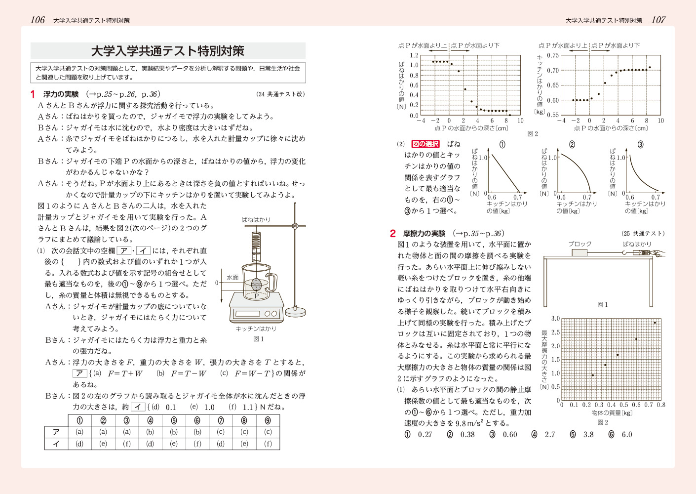 - 大学入学共通テスト特別対策 (p.106~p.111)… 実験データの処理・分析,日常生活と関連した問題 などの思考力問題で,共通テストに向けた実力アップが図れます。