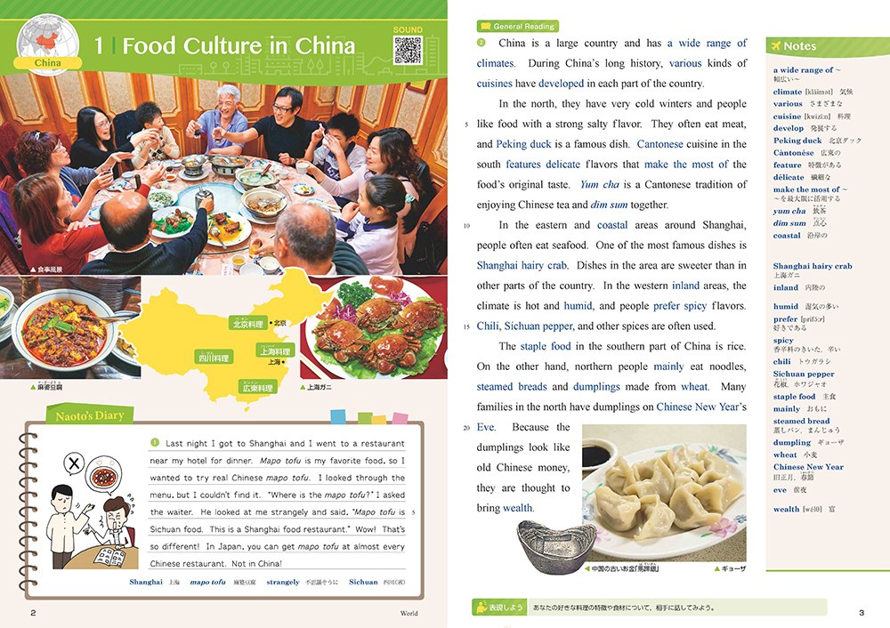 - 日本人大学生の直人が世界を旅して異文化に触れる設定です。直人の旅日記(Naoto's Diary)は本文への導入として楽しく読める内容になっています。